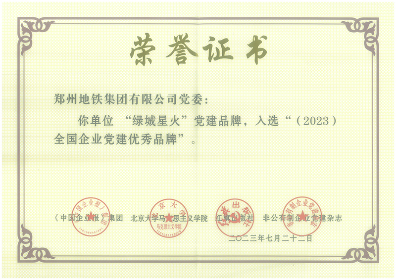 13008鄭州地鐵集團(tuán)黨委“綠城星火”黨建品牌被授予“2023年度全國(guó)企業(yè)黨建優(yōu)秀品牌”榮譽(yù)稱號(hào)
