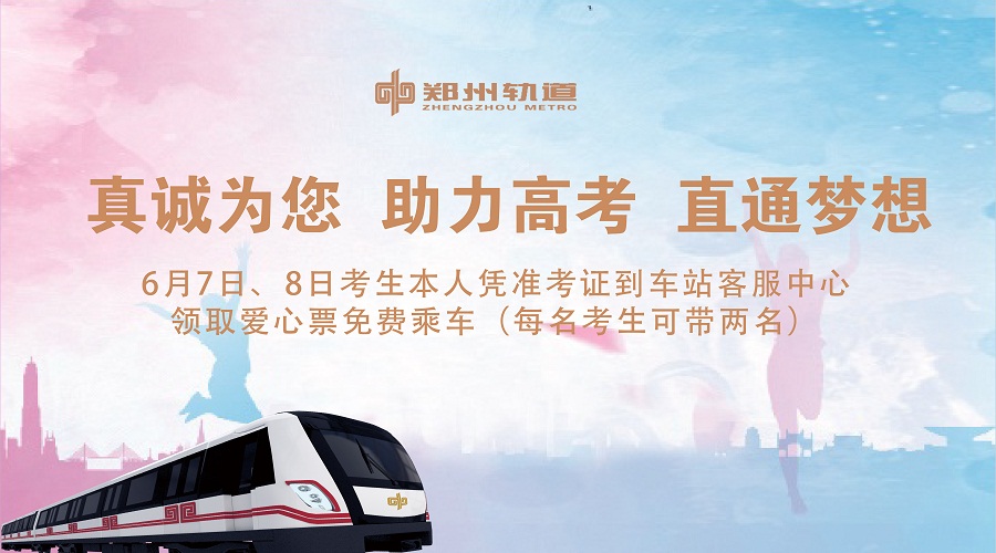 為給考生創(chuàng)造良好乘車環(huán)境,助力考生創(chuàng)佳績,鄭州地鐵將于6月7日、8日兩天開展2017年愛心助考活動。 設(shè)置助考站,愛心用品免費發(fā) 此次活動選取10個車站為愛心助考車站,分別是:(1號線)秦嶺路站、五一公園站、綠城廣場站、醫(yī)學(xué)院站、鄭州火車站、紫荊山站、黃河南路站;(2號線)關(guān)虎屯站、東大街站、南五里堡站。