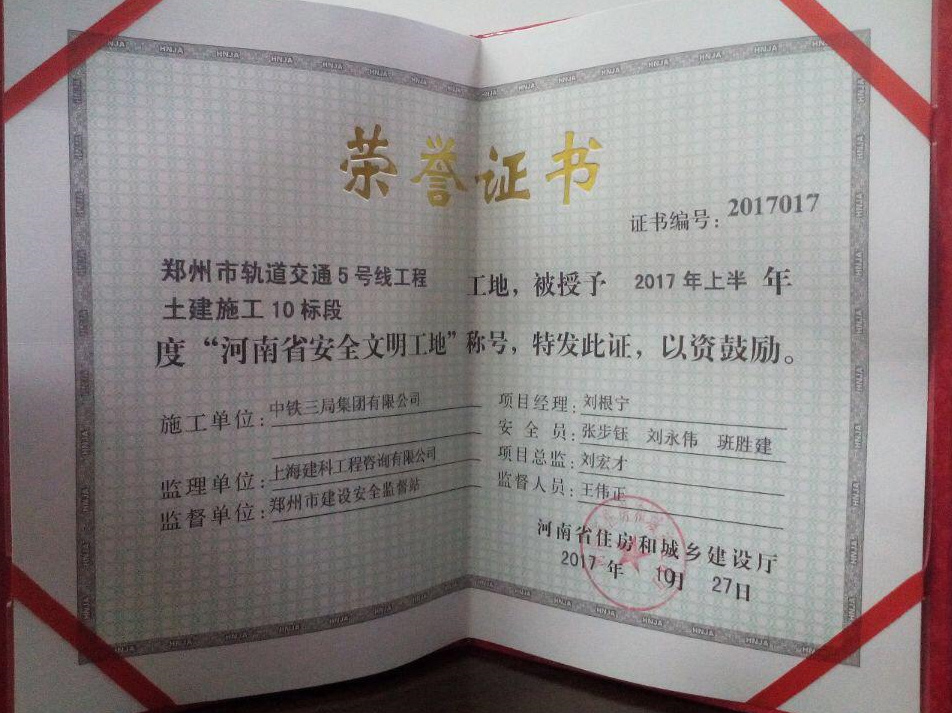 鄭州市軌道交通5號(hào)線土建10標(biāo) 被授予“河南省安全文明工地”稱號(hào)
